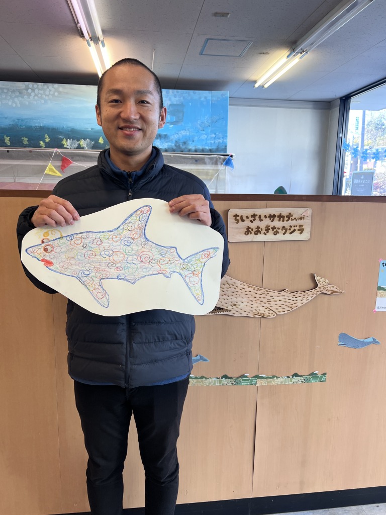 「ちいさいサカナ、おおきなクジラ」の文字が躍る壁をバックに、台紙が子供たちの手によって次々と鮮やかに染め上げられていく様子は、まさに新しい命が吹き込まれていくよう。