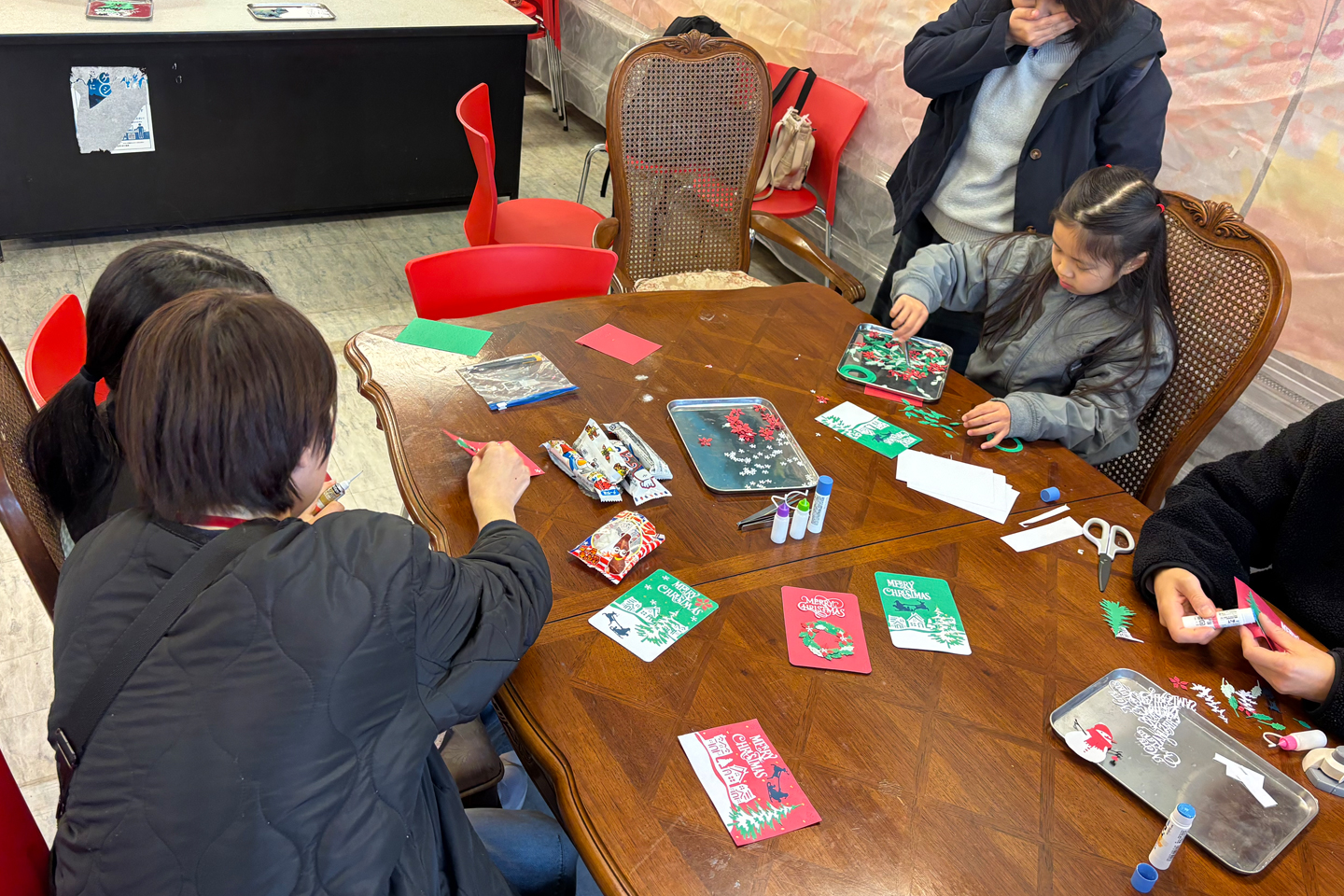 参加者は大人8名・子ども8名。世代を越えて同じテーブルを囲み、それぞれの感性でカードを仕上げる時間となりました。